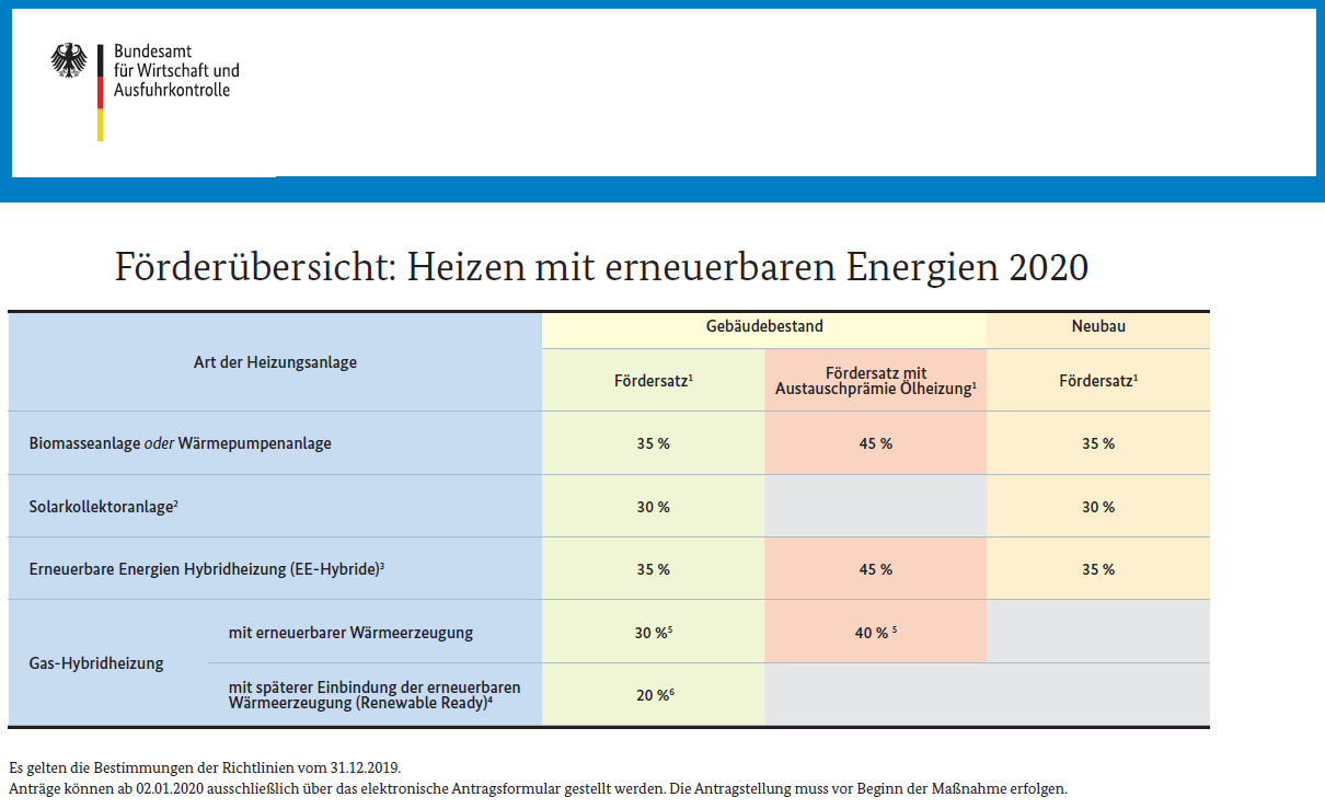 Förderübersicht Heizen mit Erneuerbaren Energien der BAFA 2020: ee_foerderuebersicht_2020